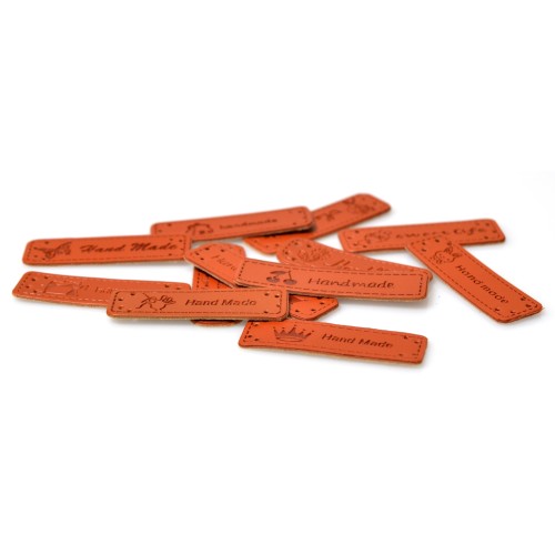 Μια σειρά χειροποίητων ετικετών οικολογικού δέρματος με διάφορα σχέδια που μπορείτε να στερεώσετε σ..